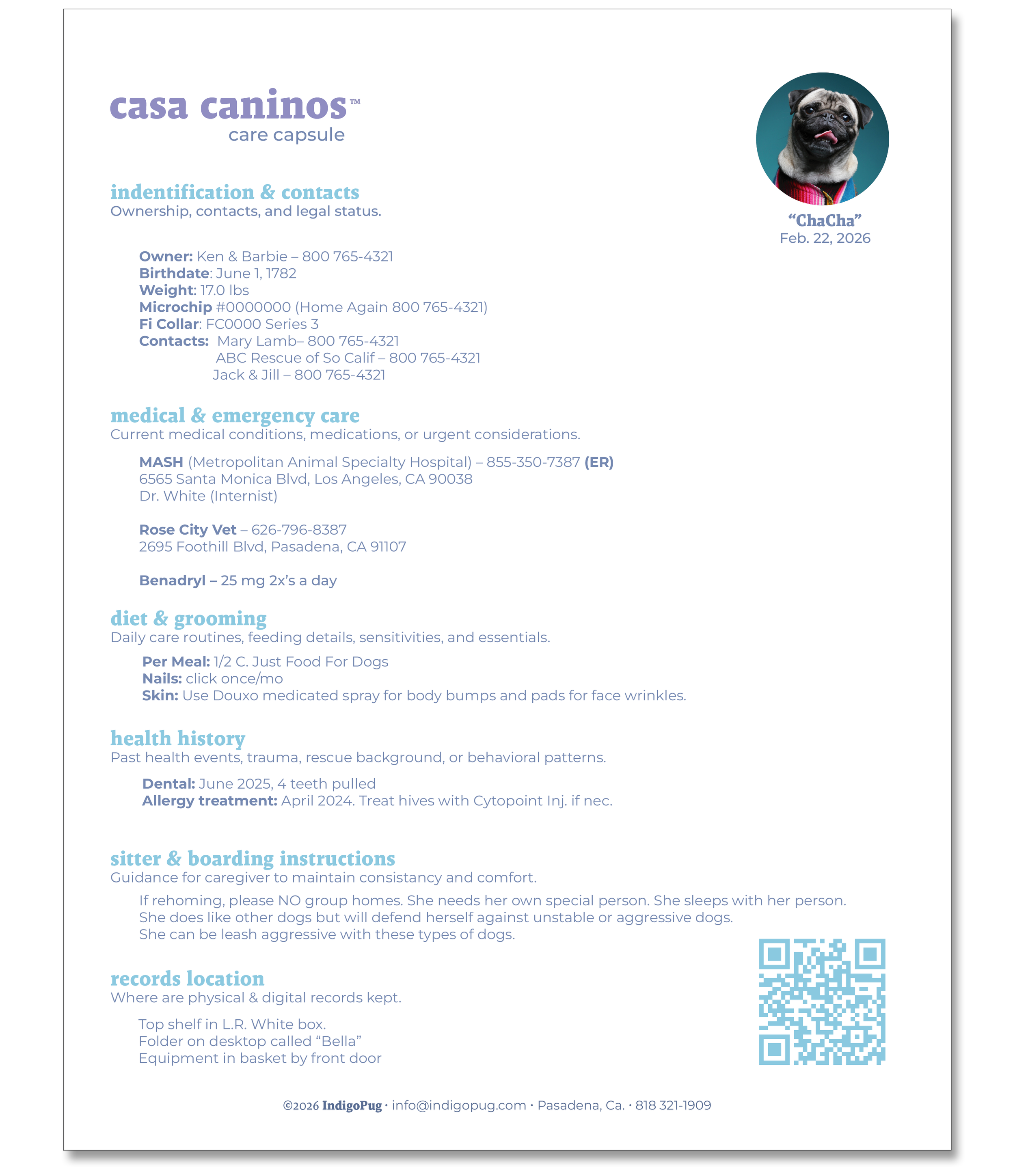 Some dogs have extra information (medical history, behavior notes, etc.). Your CareCapsule may be two pages instead of one, but the price remains the same.