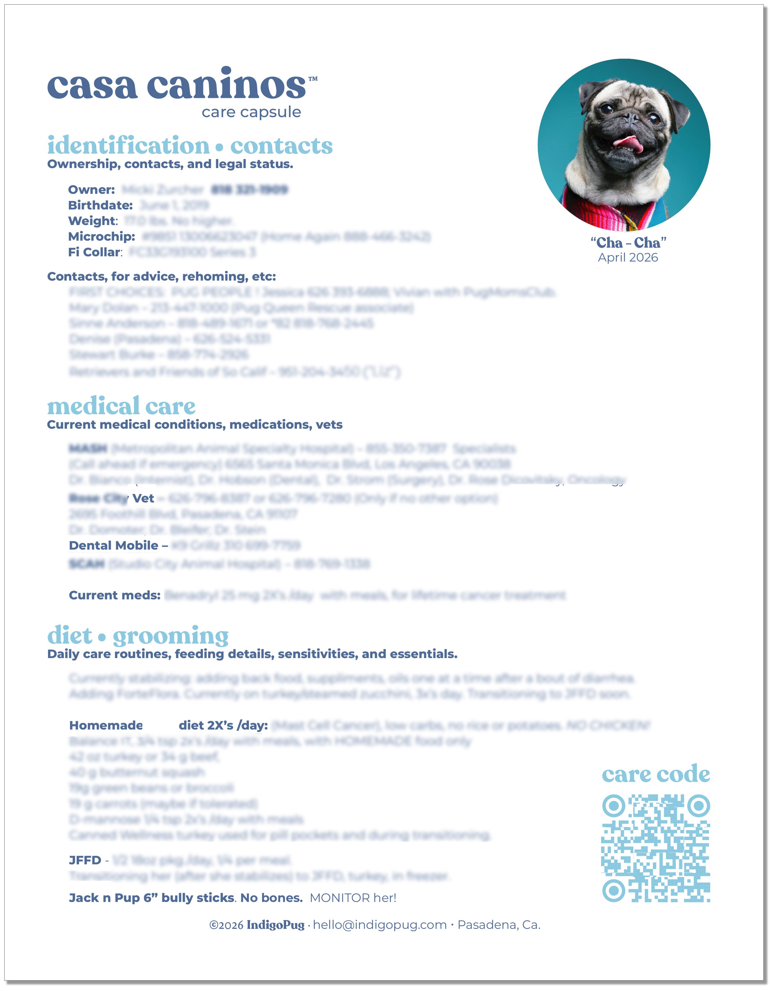 digital PDFs so you can update and revise your dog’s profile yourself, QR codes included — $55.-